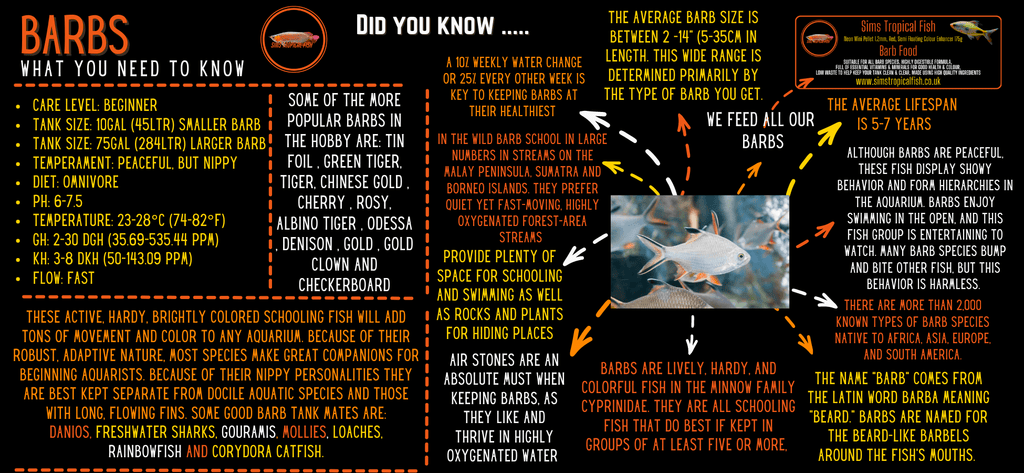 Assorted Barbs are a lively mix of colorful, active freshwater fish known for their schooling behavior and constant movement. Popular in community aquariums, barbs add energy and visual interest, making them a great choice for active display tanks. Species may vary in size, color, and pattern.