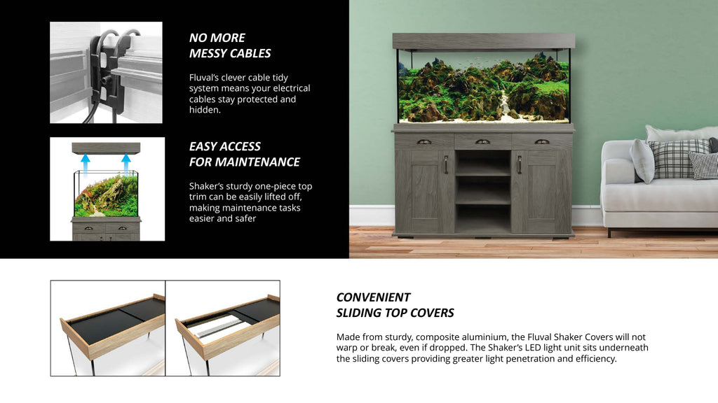With a modern take on traditional Shaker design, the Fluval Shaker 252L aquarium and cabinet will create a stunning focal point in any home. The Shaker aquarium range features exquisite attention to detail, from soft-close paneled cabinet doors to perfectly crafted joinery, making the Fluval Shaker Collection incredible value for money.