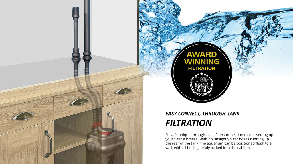 Fluval’s unique through-base filter connection makes setting up your filter a breeze! With no unsightly filter hoses running up the rear of the tank, the aquarium can be positioned flush to a wall, with all hosing neatly tucked inside the cabinet.