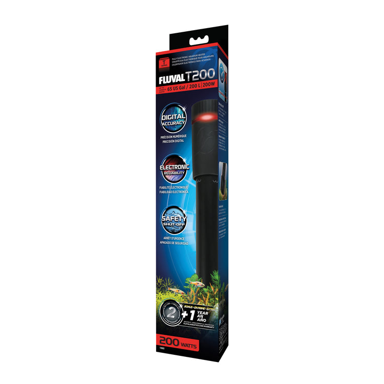 The Fluval T Series T200 200w aquarium heaters are a fully-electronic heater for aquariums up to 200L. T Series submersible heaters combine electronic accuracy, reliable monitoring, and multiple safety features to easily maintain desired aquarium water temperatures.