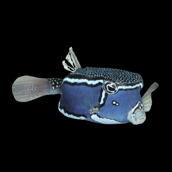 The Whitleyi Hawaiian Male Boxfish is a small, striking marine fish with a vibrant blue-green body and distinctive black spots. Its unique box-shaped body and slow, graceful swimming make it an eye-catching centerpiece for reef and community aquariums.
